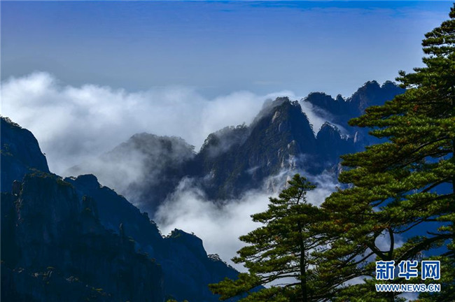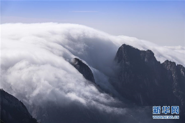 11月20日,安徽黃山風(fēng)景區(qū)雨后放晴,流云在氣流的作用下從山峰之間傾瀉而下,形成壯美的“瀑布流云”景觀。 新華社發(fā)(水從澤 攝)