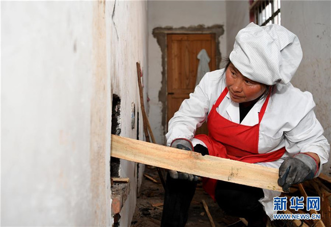 11月22日,姚新花在鍋巴廠里為土灶添柴。 新華社記者 徐亮攝