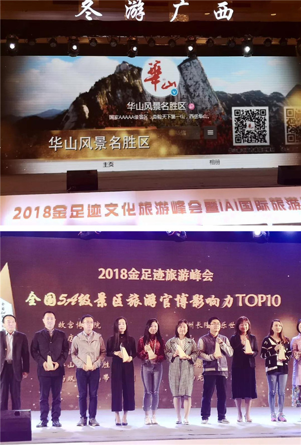 金足跡文化旅游峰會是由新浪網(wǎng)、微博打造的全國性旅游峰會,是旅游行業(yè)的年度大會。本次峰會上發(fā)布了《2018全國旅游數(shù)據(jù)報(bào)告》,公布全國省級旅游官博影響力TOP10、全國市級旅游官博影響TOP10、全國5A級景區(qū)官博影響力TOP10及新媒體創(chuàng)新獎(jiǎng)名單,華山風(fēng)景名勝區(qū)榮獲全國5A級景區(qū)官博影響力TOP10。