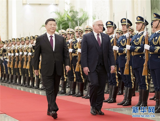 12月10日,國(guó)家主席習(xí)近平在北京人民大會(huì)堂同德國(guó)總統(tǒng)施泰因邁爾舉行會(huì)談。這是會(huì)談前,習(xí)近平在人民大會(huì)堂北大廳為施泰因邁爾舉行歡迎儀式?!⌒氯A社記者 王曄 攝