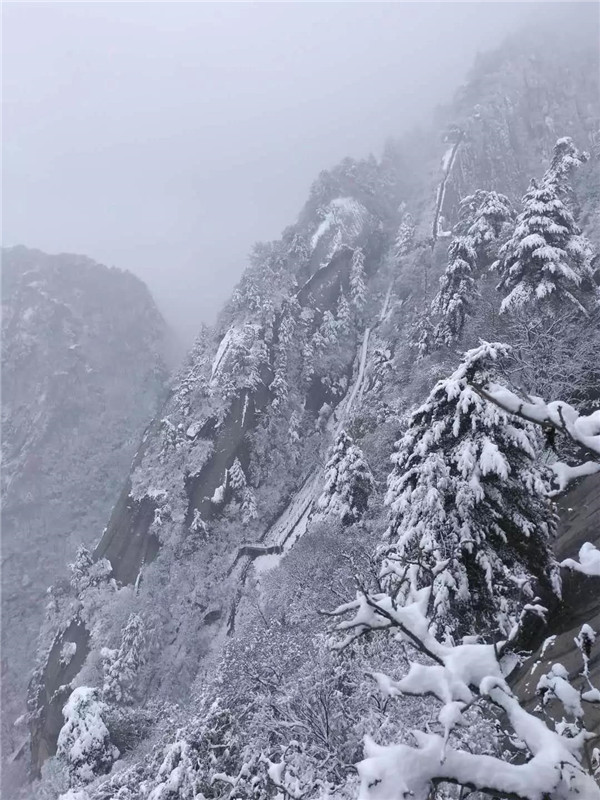 大概到了千尺幢,路就非常陡峭了,幾乎垂直攀登。戴上手套,登山杖收進(jìn)背包,抓緊鐵鏈子,懸崖外寒風(fēng)呼嘯,雨雪交加,絕壁上的古松巍然屹立,驢友相互鼓勵(lì)有說(shuō)有笑,天冷,但心是熱的。