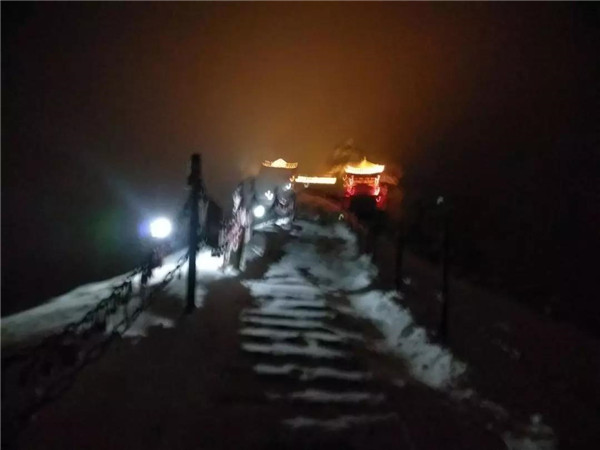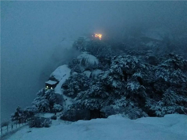 一直往上走,天色漸漸暗下來(lái)。和路上遇到的兩位山友告別后,我一個(gè)人繼續(xù)走,路面都是積雪,有的還結(jié)冰了,只好綁上冰爪,打開(kāi)手電,偶爾抬頭看看被白雪浸染的山林。忽然,前面山頂上一片燈火輝煌,不知道那是不是天上的宮闕?