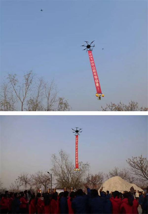 啟動儀式上,華山景區(qū)還為活動前期征集的十名幸運游客送上新年大禮包,讓跨年登山的游客享受到華山的新年祝福。同時,為了配合活動效果,讓華山新年更具新意,現(xiàn)場出動三架無人機(jī)進(jìn)行空中表演,更是以語音播報及橫幅展示的方式為現(xiàn)場游客送上新年寄語。