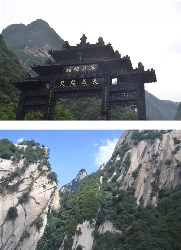 往西可去往中峰,往南可順原路返回,因暴雨如注,只得放棄攀爬中峰。順原路經(jīng)鷂子翻身,孩子仍念念不忘:“媽媽,這會兒大暴雨,肯定沒人排隊,咱們?nèi)シ_子翻身!”聽了孩子“初生牛犢不畏虎”的話,我不由哈哈大笑:“小傻瓜!這么大的暴雨,有誰去翻鷂子翻身呢?不要命啦?”在鷂子翻身入口處,孩子還是萬般眷戀地探身查看,當看到還未來得及撤離的人員身系保險繩懸掛在峭壁上,就像風(fēng)雨中掉著蛛絲的蜘蛛,被風(fēng)雨襲擊的無處藏身、進退兩難,方才知道了害怕。