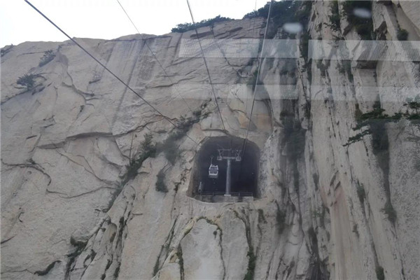 從華山的群峰頂飛越,就像乘坐飛機往云層之上爬升一樣,心中提著一口氣,不敢呼也不敢喘;遇到陡直的升降,好像失去控制的電梯讓人緊張。可是索道轎箱外的奇險,又會讓人情不自禁驚呼、尖叫!正是上午巳時,盛夏的驕陽耀眼炙熱。四周刀劈斧鑿般的潔白山體,在無遮無掩的烈日的照耀下,白的晃眼,也許這就是“華山睛雪”的由來。