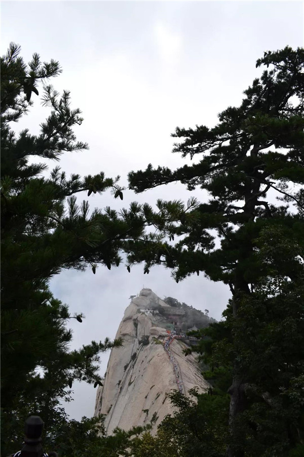 現(xiàn)在爬華山可不是“自古華山一條道”了,我們選擇坐西峰索道纜車,凌空飛渡千山萬壑。說是千山萬壑,其實華山是由一塊完整碩大的花崗巖石體構(gòu)成的?!渡胶=?jīng)》記載:“太華之山,削成而四方,其高五千仞,其廣十里。”真的很難想像,這么連綿起伏、巨大的山體,其實是一個群峰競秀的整體。華山,就是這么神奇!
