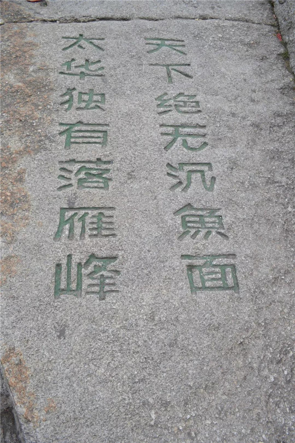 在南峰頂,孩子看到“天下絕無沉魚面,太華獨有落雁峰”的題刻,打趣我:“媽媽,你叫鴻雁,這里又叫落雁峰,真是和你有緣呢!快來這塊大石頭上落落腳,歇一歇!”“好??!咱倆都爬累了,都歇一歇!”我為孩子的體貼欣慰!