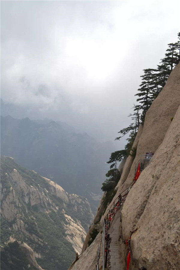 面向西峰方向,左側(cè)是斧劈般的絕壁,右側(cè)是坡度陡峭的山嶺。山脊兩側(cè)豎有結(jié)實的鐵柱,以腕粗的鐵鏈相連續(xù)。膽小的人屏住呼吸,緊抓鐵鏈前行;膽大的年輕人,不抓鐵鏈,走在中間,總讓人擔心他會滑跌!腳下的山脊有一定坡度,并不能踩平實,就像走在傾斜的平衡木上。緊窄處,上山下山的人需錯身通行。華山之險,讓我們刻骨銘心!