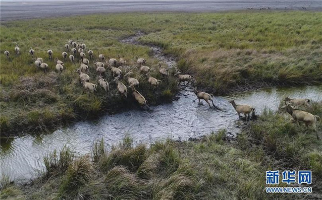 這是2017年11月14日在江蘇大豐麋鹿國家級自然保護(hù)區(qū)拍攝的麋鹿(無人機(jī)拍攝)。新華社記者 季春鵬 攝