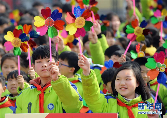 2月25日,安徽省亳州市風(fēng)華桐鄉(xiāng)路小學(xué)的學(xué)生們?cè)谛聦W(xué)期主題活動(dòng)上舞動(dòng)風(fēng)車(chē)。 新華社發(fā)(張延林 攝)