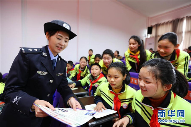 2月25日,在貴州省赤水市第三小學(xué),民警在開(kāi)學(xué)第一課上給學(xué)生們講解校園安全知識(shí)。 新華社發(fā)(王長(zhǎng)育 攝)