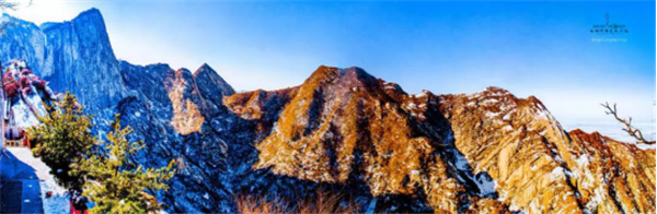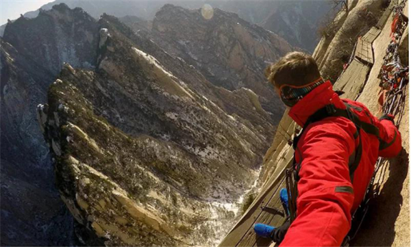 我獨自一人出發(fā),一段垂直的石隙,鐵條插在巖石之中,道路向下延伸,風刮得很大,我雙手麻木,死死地抓住鐵鏈,慢慢向下挪動,腳下是一千米深的峽谷,這是一個恐懼與光榮交織的時刻。我走在棧道上,左右上下地欣賞著風景,周圍大山巨大而孤獨,我感覺自己就像是一個塵埃,真的太渺小了。冰屑落到頭頂上,幸虧不是石塊。我聽到一群中國游客笑著從石隙中下來,我停下來照了幾張相,要回去必須原路返回,這同樣不容易,我很感謝地歸還了手套,繼續(xù)向其他山峰攀登。由于有安全保護措施,因此我不認為華山是“世界上最危險的道路”。