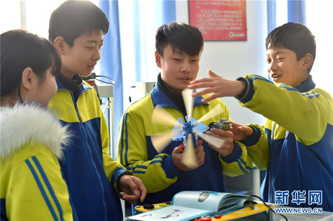 2月28日,在石家莊市藁城區(qū)韓家洼中學(xué),學(xué)生在組裝“機(jī)器人”。新華社發(fā)(張曉峰 攝)