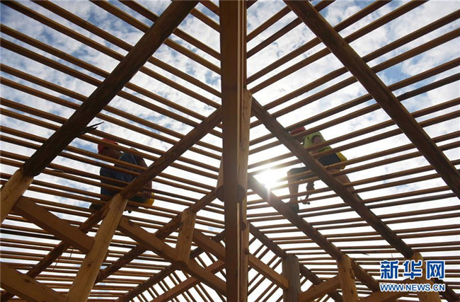 在湖北省宣恩縣曉關(guān)侗族鄉(xiāng),工人在建設(shè)吊腳樓(2018年7月26日攝)。2018年,當(dāng)?shù)卣_始修建6座新的侗寨吊腳樓,為符合易地搬遷政策的貧困戶實(shí)施搬遷。新華社發(fā)(王俊 攝)