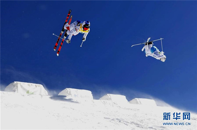 運(yùn)動(dòng)員在河北張家口市崇禮區(qū)太舞滑雪場(chǎng)參加自由式滑雪雪上技巧世界杯比賽(2018年12月16日攝)。新華社記者 楊世堯 攝