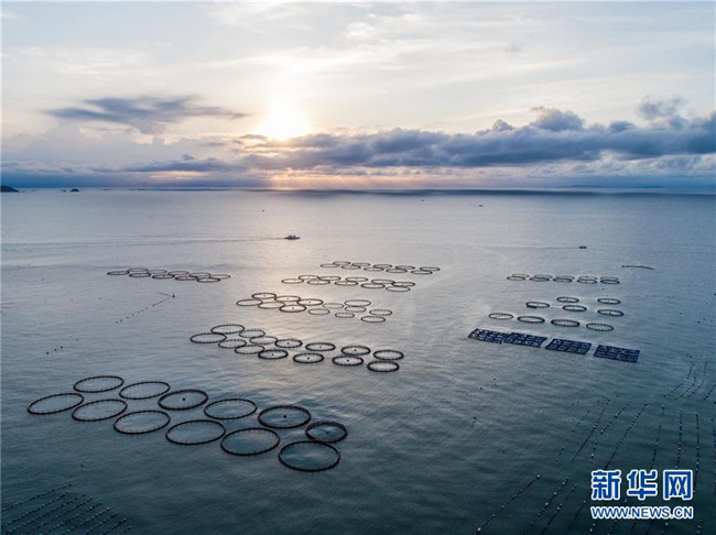 夕陽(yáng)映照下的浙江省溫州市平陽(yáng)縣南麂島馬祖岙海域,圓形的都是大黃魚養(yǎng)殖網(wǎng)箱(2018年8月18日無(wú)人機(jī)拍攝)。新華社記者 徐昱 攝