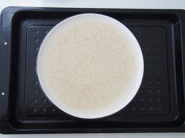 2.將大米淘洗一下放在盤子中,加入清水