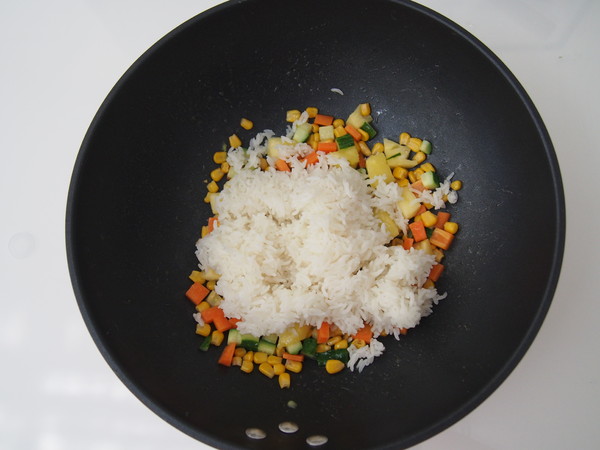 12.將米飯放入炒勻,加入鹽調(diào)味即可