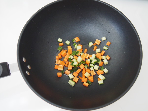 6.胡蘿卜洗凈去皮后切成小丁,黃瓜洗凈后切成丁