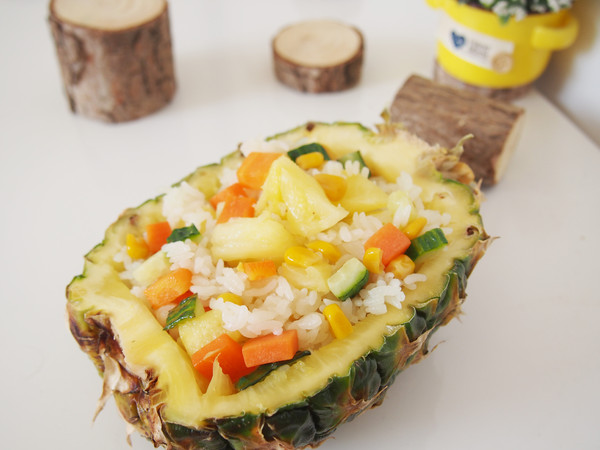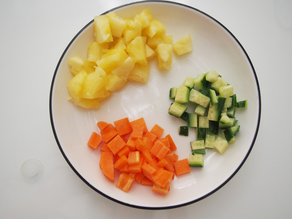 主料:菠蘿100克  胡蘿卜50克  黃瓜50克  甜玉米粒50克  大米200克  清水180克