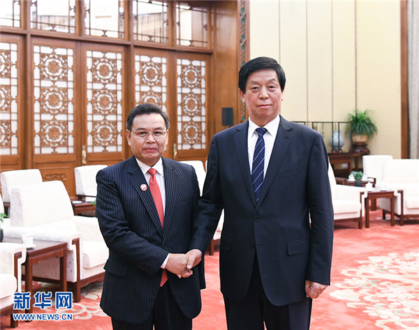 全國人大常委會委員長栗戰(zhàn)書19日在人民大會堂會見老撾建國陣線中央主席賽頌蓬。