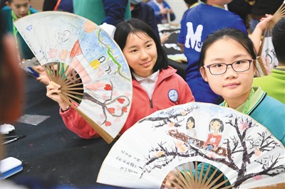 兩岸和平小天使在臺北民族小學(xué)的特色藝術(shù)課程上繪制扇面。