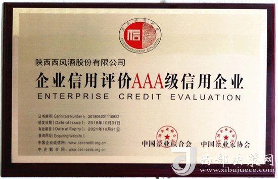 西鳳股份公司榮獲全國“AAA級信用企業(yè)”榮譽稱號