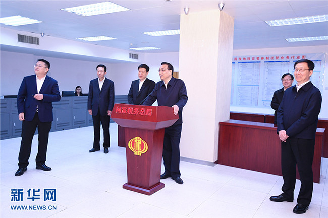 3月21日,中共中央政治局常委、國(guó)務(wù)院總理李克強(qiáng)到財(cái)政部、稅務(wù)總局考察,并主持召開(kāi)座談會(huì)。中共中央政治局常委、國(guó)務(wù)院副總理韓正出席。這是李克強(qiáng)在稅務(wù)總局考察。 新華社記者 燕雁 攝