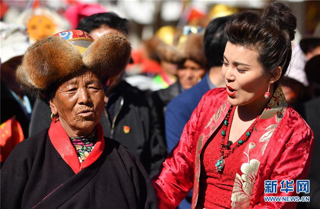 克松社區(qū)村民央金(左)和歌手合唱《我和我的祖國(guó)》(3月20日攝)。 新華社記者 覺果 攝