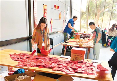 春節(jié)那天,學(xué)校為中國留學(xué)生安排了新春活動(dòng),準(zhǔn)備了很多裝有金幣巧克力的紅包,派送的小餅干里還夾著新年祝福;不經(jīng)意間,我驚喜地發(fā)現(xiàn),墻面上還藏了許多謎語。對于過年還要上課的我們來說,這已是最大的“年味”了。
