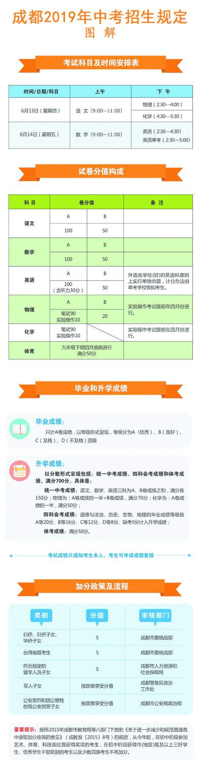 今年中考考試時間與往年一樣,為6月13日、14日,考試科目和計分辦法均未作調(diào)整。也即是說,今年中考統(tǒng)一考試科目依然為語文、數(shù)學(xué)、英語、物理、化學(xué)、體育六科。其中,物理、化學(xué)包括實驗操作考試。體育考試以及物理、化學(xué)實驗操作考試在九年級下期4月底以前,由各區(qū)(市)縣組織進(jìn)行。九年級結(jié)束時,語、數(shù)、英、物、化五科的畢業(yè)考試與升學(xué)考試一并進(jìn)行,各科筆試考試均為閉卷考試,具體時間安排詳見圖解。其中,外語類學(xué)校(班),如成外實外等校的英語科,原則上單獨命題,統(tǒng)一考試。