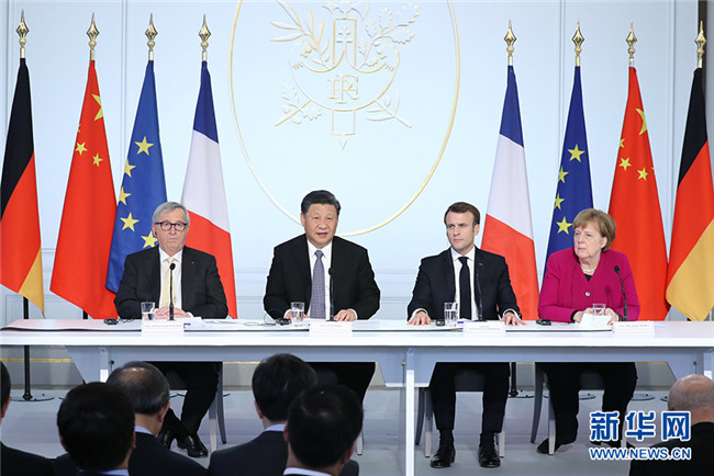 3月26日,國家主席習近平在巴黎同法國總統(tǒng)馬克龍一道出席中法全球治理論壇閉幕式。德國總理默克爾、歐盟委員會主席容克應(yīng)邀出席。 新華社記者 鞠鵬 攝