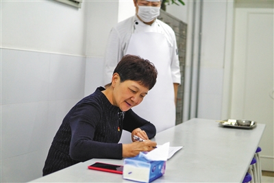 安樂幼兒園園長(zhǎng)張萍試吃幼兒午餐并進(jìn)行記錄評(píng)價(jià)。新京報(bào)記者 馮琪 攝