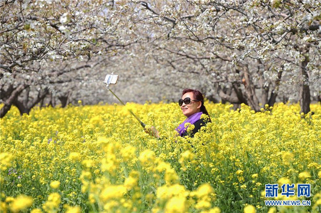 4月6日,在貴州六盤水盤州市烏蒙大草原景區(qū),游客在花海中自拍。清明時(shí)節(jié),人們外出旅游,踏青賞花,感受春天的美好。 新華社發(fā)(劉佳躍 攝)