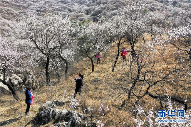 4月7日,游客在河北省遷西縣興城鎮(zhèn)杏花谷參觀(無(wú)人機(jī)拍攝)。清明時(shí)節(jié),人們外出旅游,踏青賞花,感受春天的美好。 新華社發(fā)(王愛(ài)軍 攝)