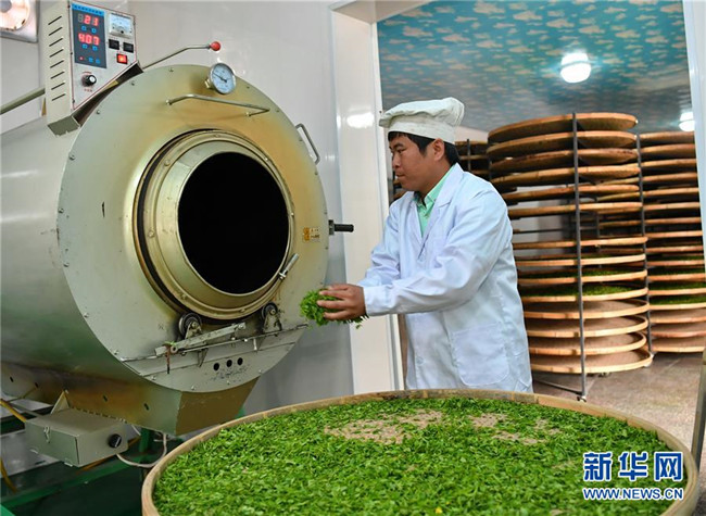 4月10日,平定縣冠山鎮(zhèn)后溝村的村民將連翹葉放入炒茶機。