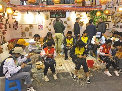 學生藝術(shù)實踐工作坊,來自福建安溪的小學生展示竹藤編。記者 馮琪 攝