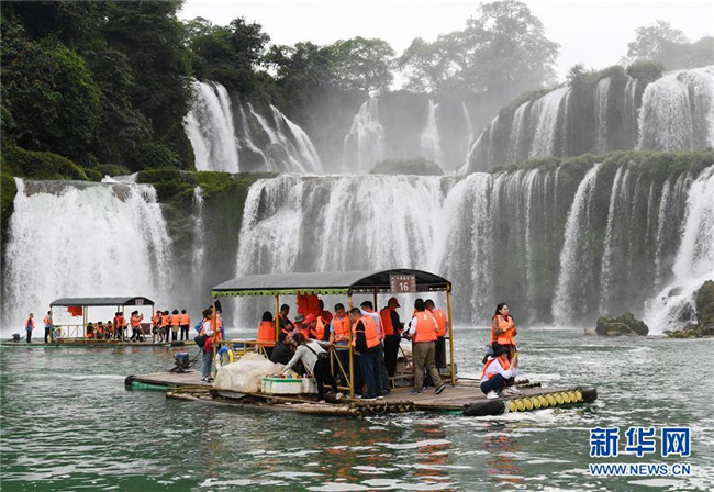 近日,隨著降雨增多,位于中越邊境的廣西大新縣德天瀑布水量增大,吸引大批游客前來觀光游覽。新華社記者 陸波岸 攝