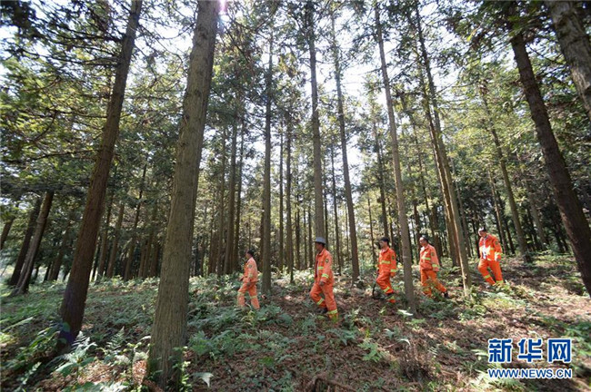 4月27日,在貴州省畢節(jié)市赫章縣平山國有林場,李瓊江(右一)、李?。ㄓ胰┖土謭雎毠ぴ谧o(hù)林途中。 新華社記者 楊楹 攝