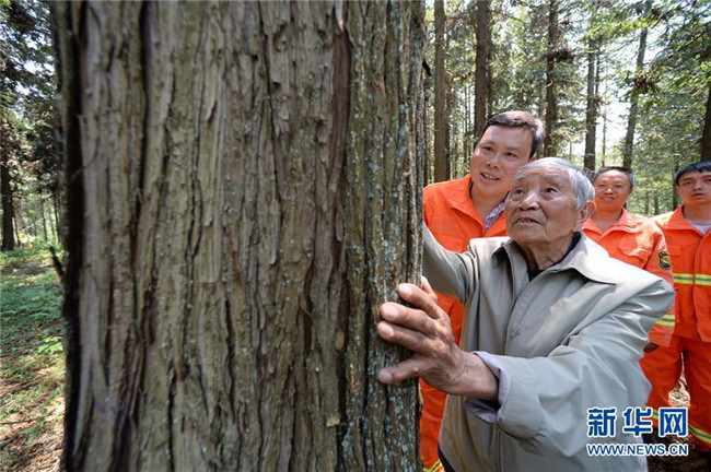 4月27日,在貴州省畢節(jié)市赫章縣平山國有林場,李代關(guān)老人(前)在查看當(dāng)年和同事種的杉樹。 新華社記者 楊楹 攝