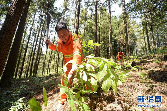 4月27日,在貴州省畢節(jié)市赫章縣平山國有林場,李瓊江(左)和李健在清除雜灌木。 新華社記者 楊楹 攝