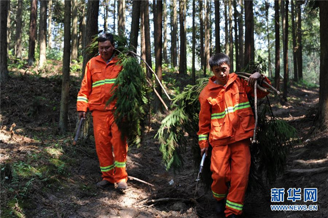4月27日,在貴州省畢節(jié)市赫章縣平山國有林場,李瓊江(左)和李健搬運清除的雜灌木。 新華社記者 楊楹 攝