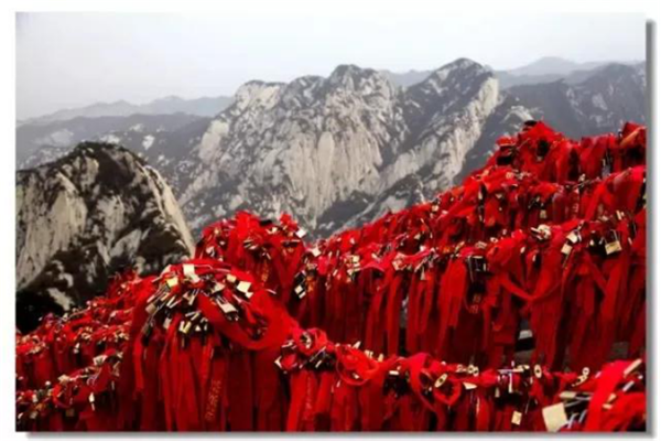 華山是一座愛情的殿堂,華山上的愛情故事悲烈、凄美而感人。我們曾經(jīng)為世界上許許多多的愛情故事所感動。其實,發(fā)生在華山上的愛情故事一樣讓人的心情無法平靜。眾所周知的神話傳說《寶蓮燈》中,三圣母為了愛情,被二郎神巨石壓在華山頂上;弄玉為了愛情,逃離安逸的生活,與蕭史雙雙來到華山,琴瑟合鳴;漢臣王咸不畏艱險,到華山尋找賢妻南陽公主等等這些愛情故事,感天動地,流傳不衰,不知讓多少人為之贊嘆。也許是讓華山上這些動人的愛情故事所感染,不知從什么時候開始,在代表著堅實連接的一串串鐵鏈上,游人掛上了閃閃的金鎖,把矢志不渝的愛情鎖在華山上,在華山的見證下,祝愿自己的愛情如同華山一樣永遠不會改變。