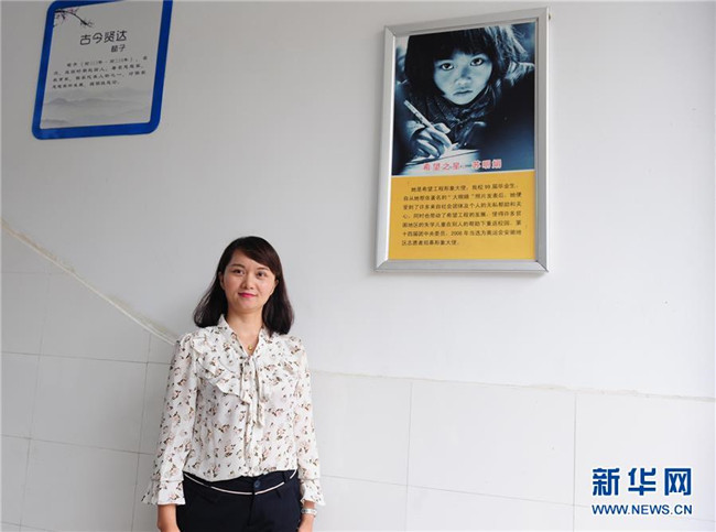 2018年5月29日,在安徽金寨三合實(shí)驗(yàn)學(xué)校,蘇明娟與當(dāng)年的宣傳照片合影。新華社發(fā)(王從啟 攝)