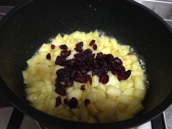 5.煮至蘋(píng)果軟蔫半透明時(shí)倒入蔓越莓干拌勻