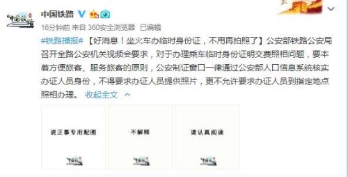 據(jù)中國鐵路總公司官方微博消息,公安部鐵路公安局召開全路公安機關(guān)視頻會要求,對于辦理乘車臨時身份證明交費照相問題,要本著方便旅客、服務(wù)旅客的原則,公安制證窗口一律通過公安部人口信息系統(tǒng)核實辦證人員身份,不得要求辦證人員提供照片,更不允許要求辦證人員到指定地點照相辦理。