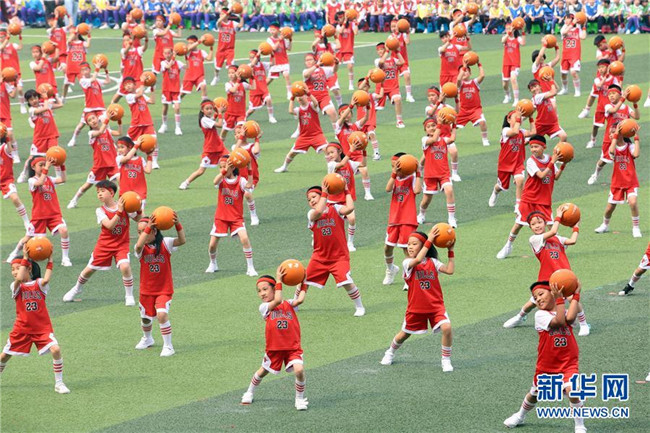 5月12日,天津市和平區(qū)岳陽(yáng)道小學(xué)學(xué)生在運(yùn)動(dòng)會(huì)上展示集體籃球操。