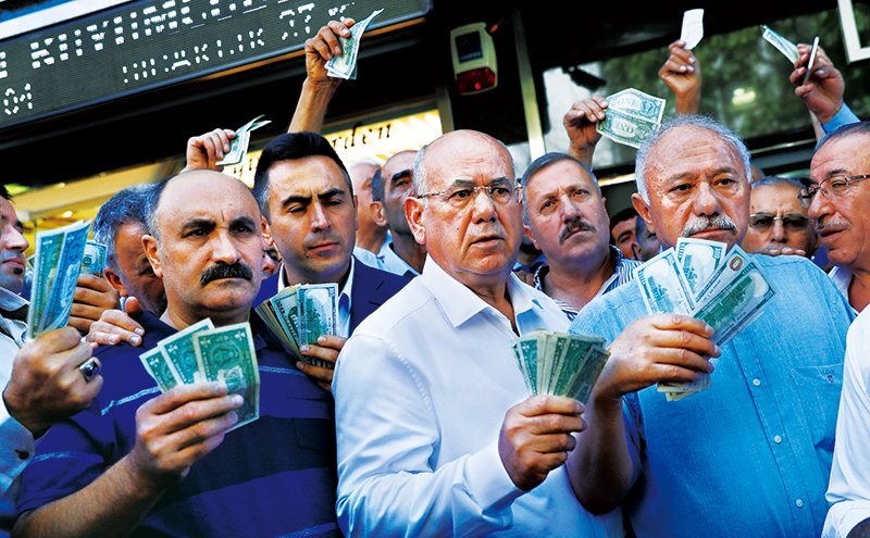 2018年,由于美聯(lián)儲(chǔ)加息導(dǎo)致國際游資大規(guī)?;亓鳎绹鴮?duì)土耳其、伊朗進(jìn)行制裁以及貿(mào)易保護(hù)主義的影響,俄羅斯、阿根廷、土耳其、南非等不少經(jīng)濟(jì)體貨幣遭遇大幅貶值。圖為2018年8月14日,在土耳其首都安卡拉,人們響應(yīng)政府號(hào)召,手持美元站在貨幣兌換處前,出售手中的美元支持本國貨幣里拉。 新華社/路透
