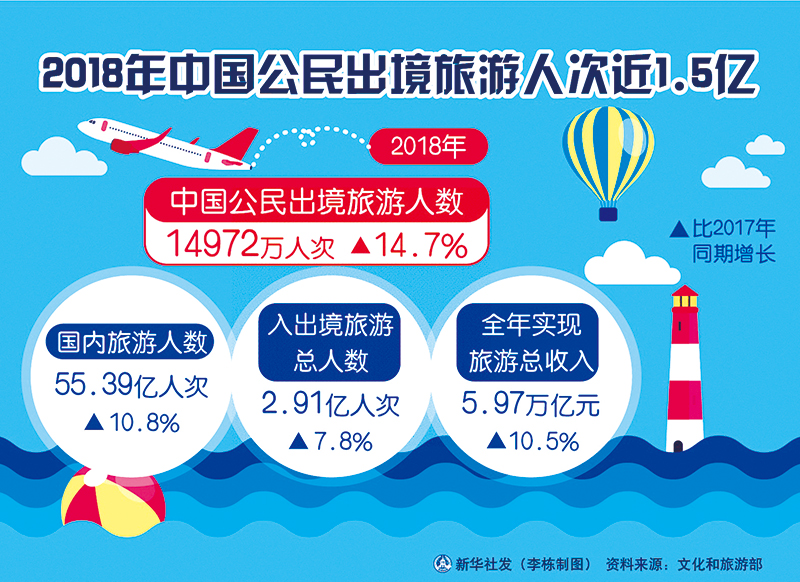 近年來,隨著我國經(jīng)濟(jì)社會(huì)發(fā)展,人民生活水平得到顯著提高,國民旅游休閑生活更加精彩,出境旅游成為新的時(shí)尚。圖為2018年中國公民出境旅游相關(guān)數(shù)據(jù)。 新華社發(fā) 李棟/制圖