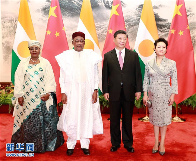 5月28日,國家主席習近平在北京人民大會堂同尼日爾總統(tǒng)伊素福舉行會談。這是習近平和夫人彭麗媛同伊素福夫婦合影。 新華社記者 龐興雷 攝